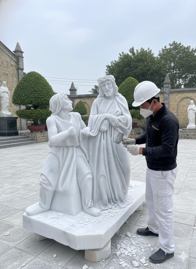 Đặc biệt, đá trắng mang sắc thái tinh khôi, tượng trưng cho sự thánh thiện và ánh sáng, rất phù hợp để thể hiện thần thái của Chúa.
