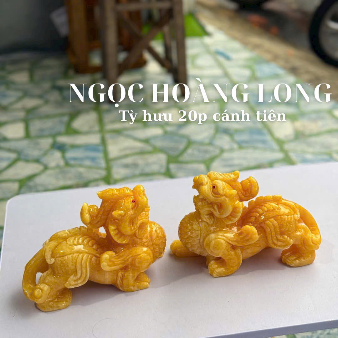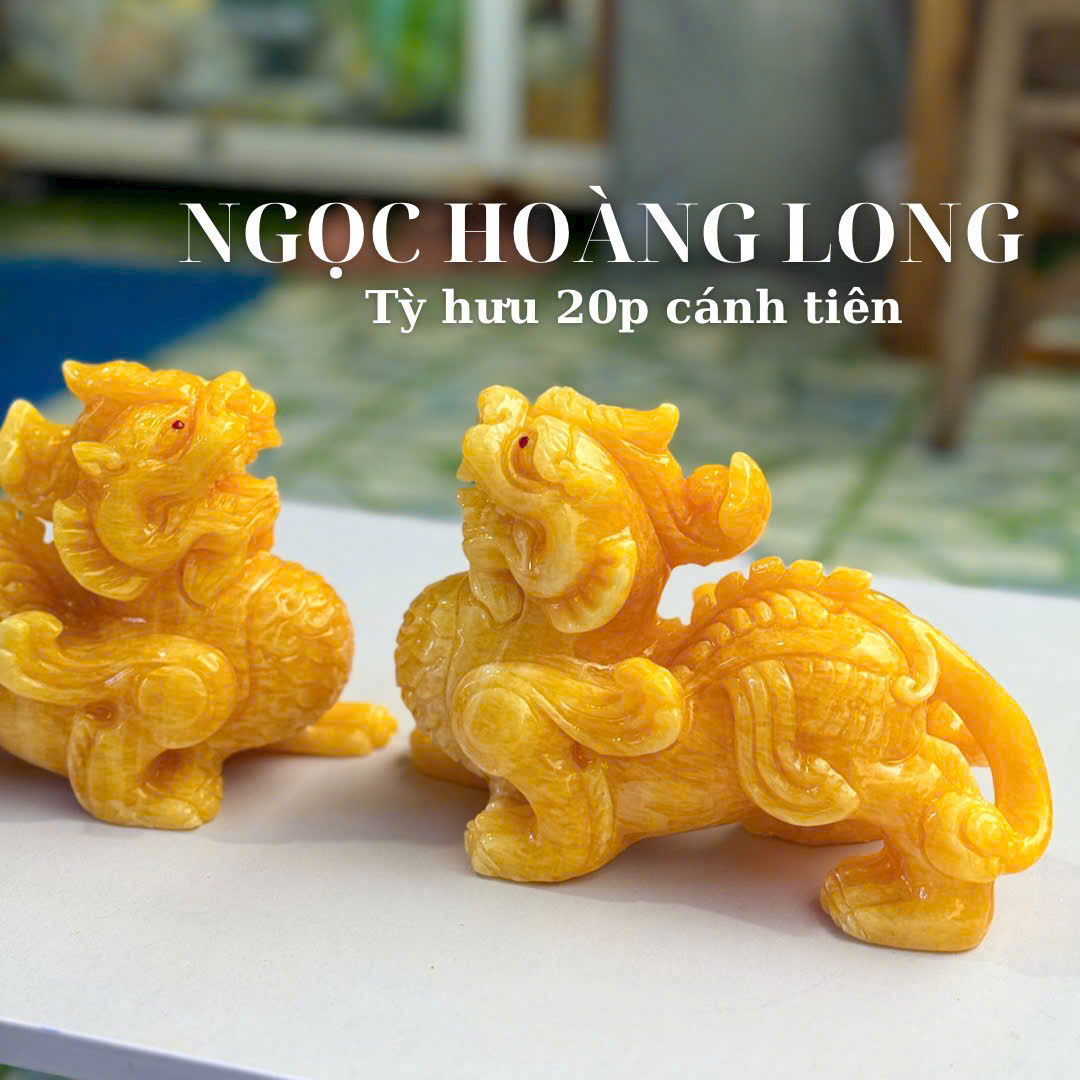Ngọc hoàng long là dòng đá tự nhiên được yêu thích nhờ sắc vàng ấm, trải dài từ vàng nhạt đến vàng mật ong. Màu đá ánh nhẹ dưới ánh đèn, bề mặt mịn và độ trong vừa phải, giúp tượng mang vẻ đẹp sang trọng nhưng không quá chói.