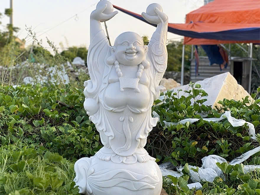 TƯỢNG PHẬT DI LẶC ĐỨNG DƠ TAY BẰNG ĐÁ TRẮNG TỰ NHIÊN – BIỂU TƯỢNG CỦA HẠNH PHÚC VÀ THỊNH VƯỢNG
