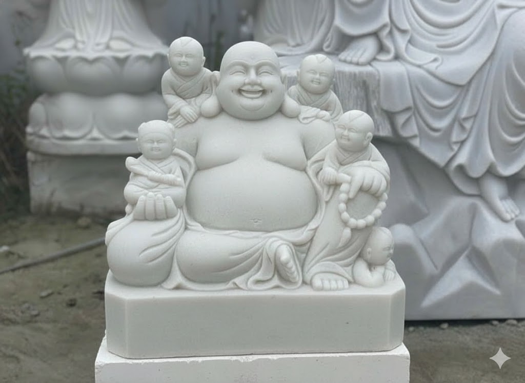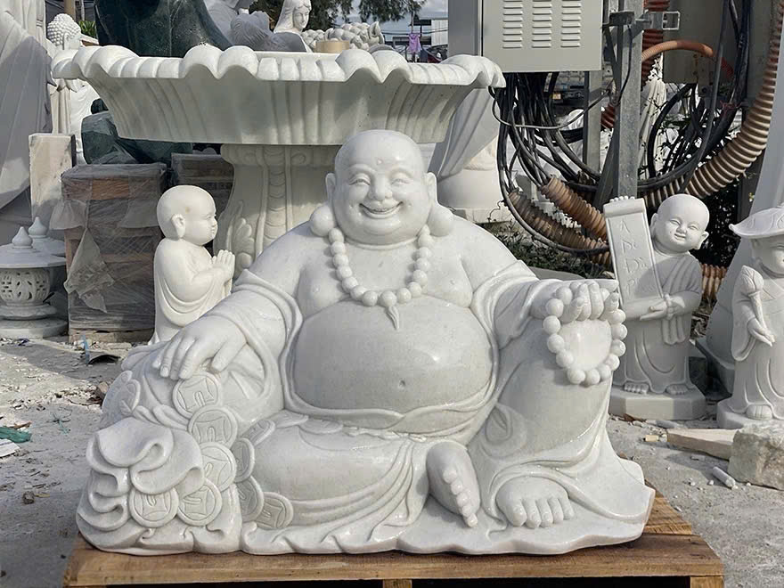 Tượng Ông Di Lặc với nụ cười rạng rỡ mang đến cảm giác dễ chịu cho bất kỳ ai nhìn thấy. Màu trắng tinh khiết của đá giúp lan tỏa sự nhẹ nhàng, tạo cảm giác bình an và giải tỏa căng thẳng.