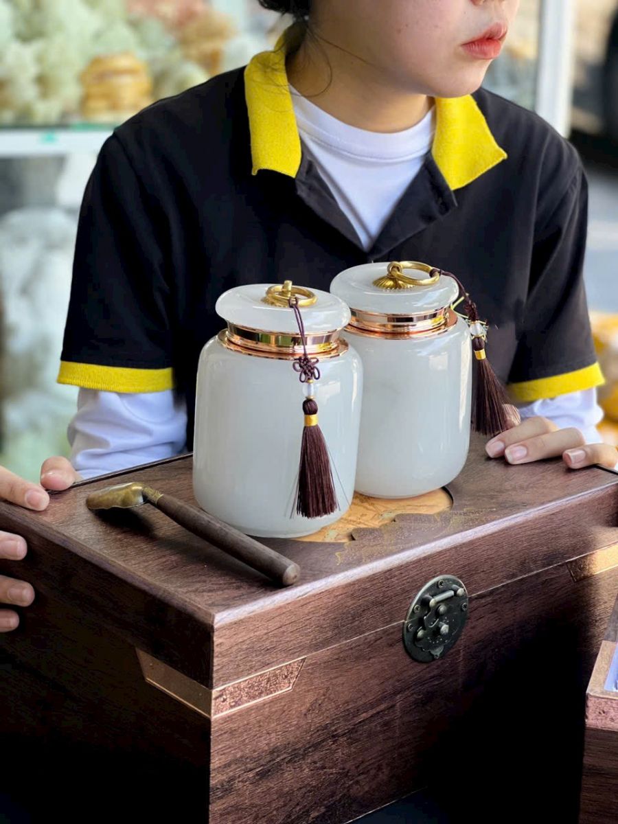 Tạo điểm nhấn trang trí: Hũ đựng trà bạch ngọc tự nhiên còn là một vật trang trí đẹp mắt và độc đáo trong không gian sống. Với màu vàng tự nhiên và các vân mảnh mai, nó có thể tạo điểm nhấn độc đáo cho bàn trang trí, kệ sách hoặc không gian thưởng trà. Hũ đựng trà bạch ngọc không chỉ là một sản phẩm hữu ích mà còn là một vật trang trí đẹp và tinh tế.